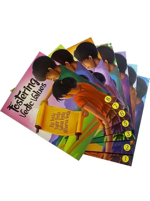 ‘Fostering Vedic Values’ is a series of 8 books with 15 chapters in each. Almost half the chapters focus on ensuring that the children are able to obtain a reasonably good understanding of the key spiritual principles as highlighted in Vedas. The remaining chapters are focused towards imbibing the spirit of patriotism and social service. Throught these, we are envision the children to develop as responsible citizens, who contribute to the world as a family, but in the face of a national threat, are also ardent patriots. We hope to see them evolve into empowered individuals who can overcome the challenges of life through spiritual strength and lead themselves, their families and societies to peace and happiness.